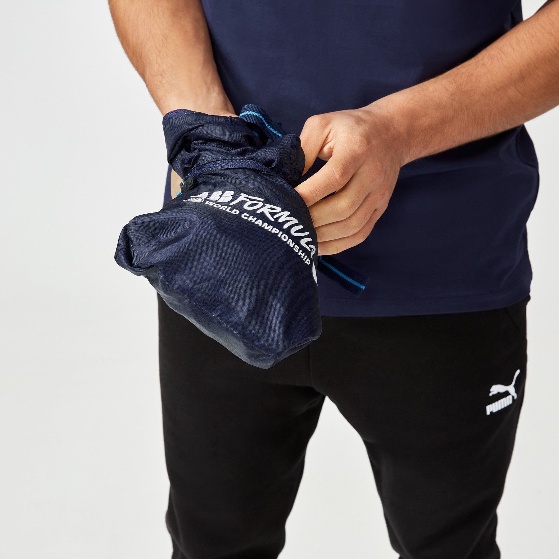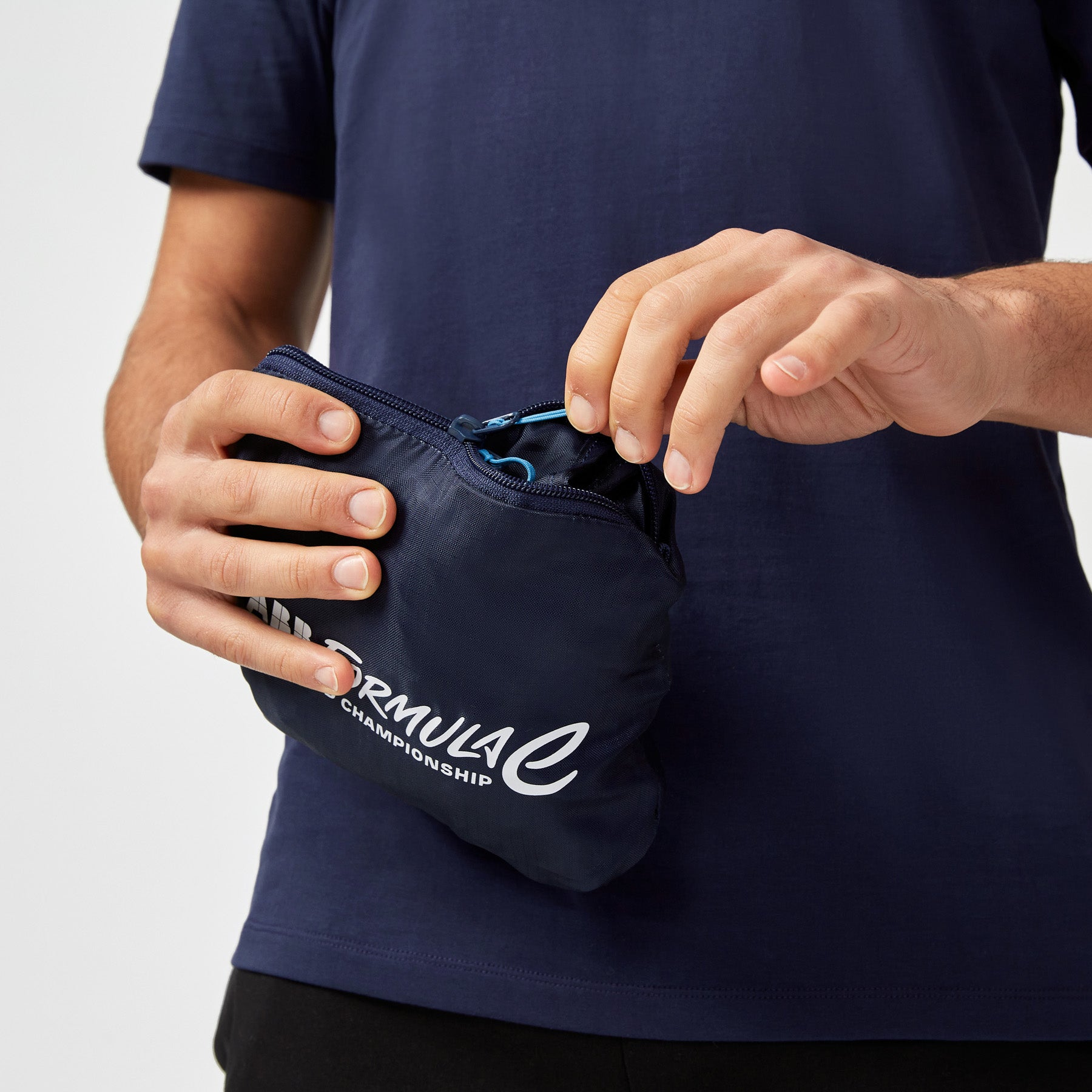 Lightweight, practical, and stylish — the Formula E Navy Packable Backpack is designed for everyday use and convenience. Made from 100% polyester, this backpack easily folds into its own front zip pocket, making it perfect for travel or on-the-go storage. It features a bold Formula E wordmark print on the front, the signature E logo on the strap, and striped webbing tape adjusters for a sporty touch. Lightly padded shoulder straps and a top carry handle ensure comfortable carrying all day long.