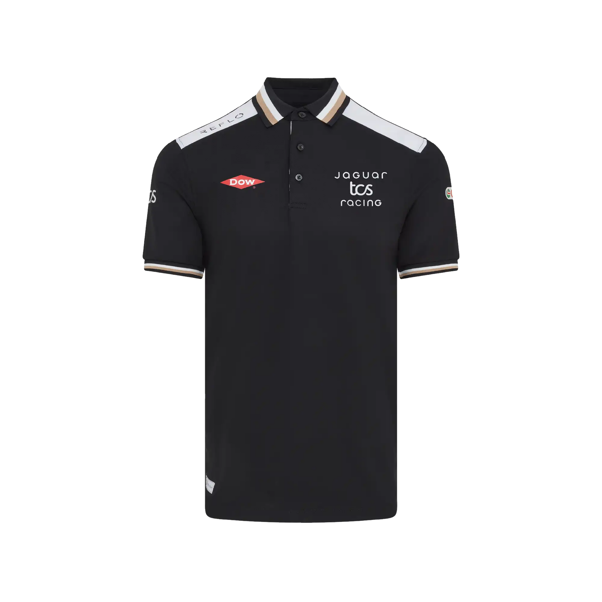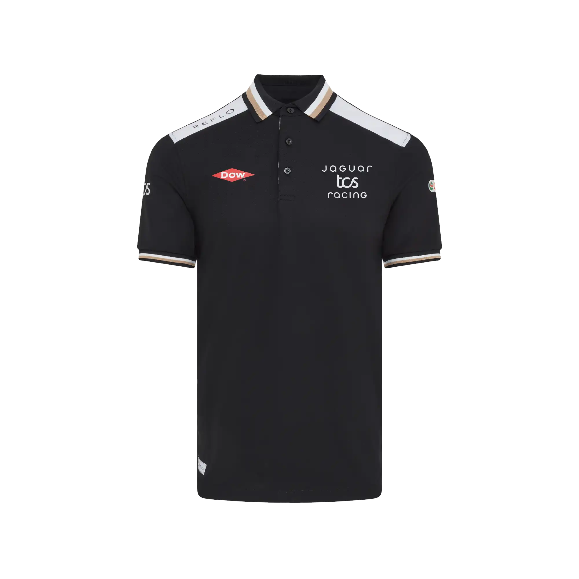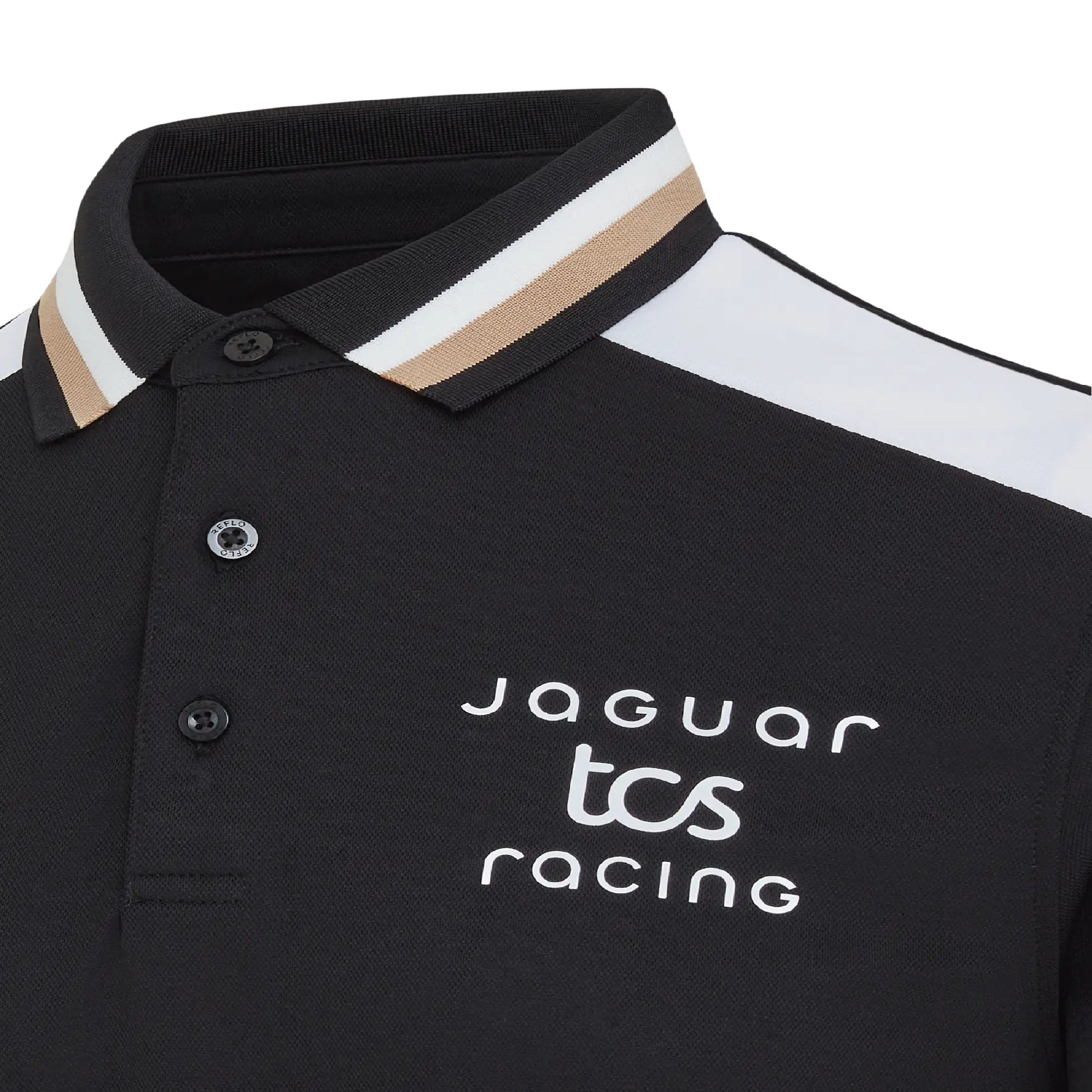 A performance-led polo featuring black fabric with white shoulder panels and a subtle gold trim. Made with our Reloop technology, using 100% recycled polyester for lightweight comfort. Ideal for warm race weekends and a polished option for representing Jaguar TCS Racing across the ABB FIA Formula E calendar on the golf course or in casual wear.