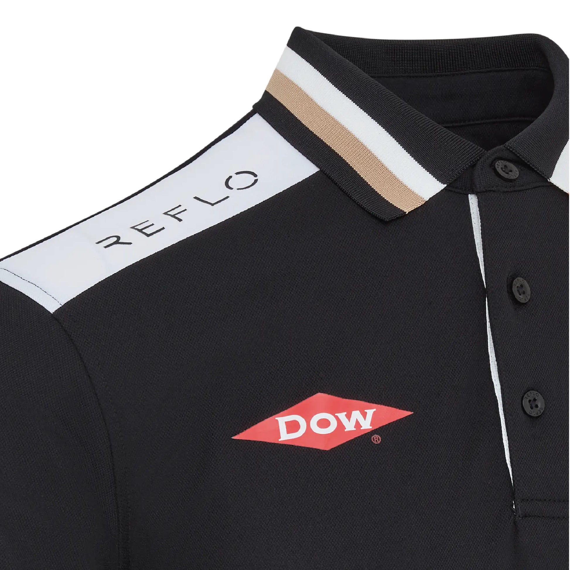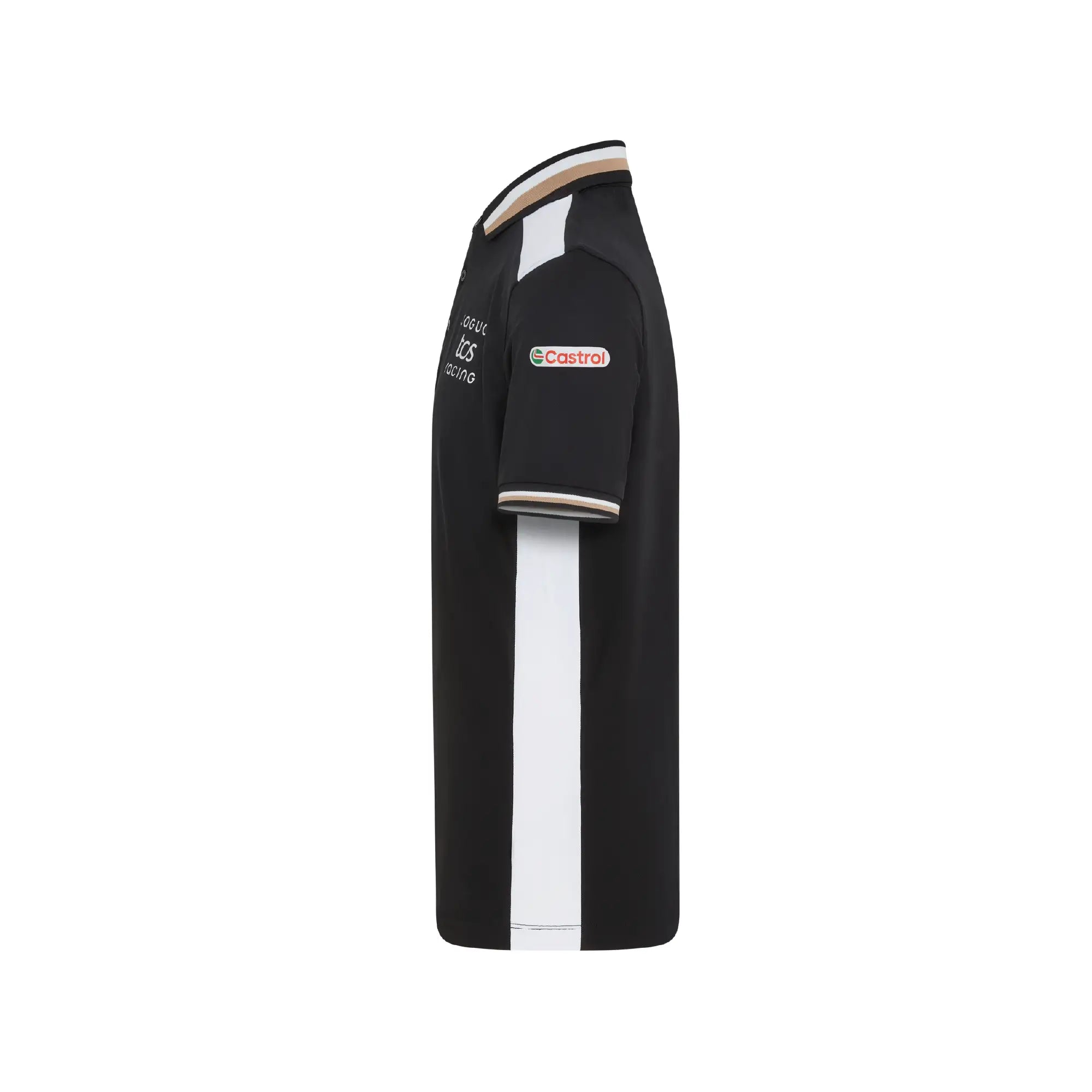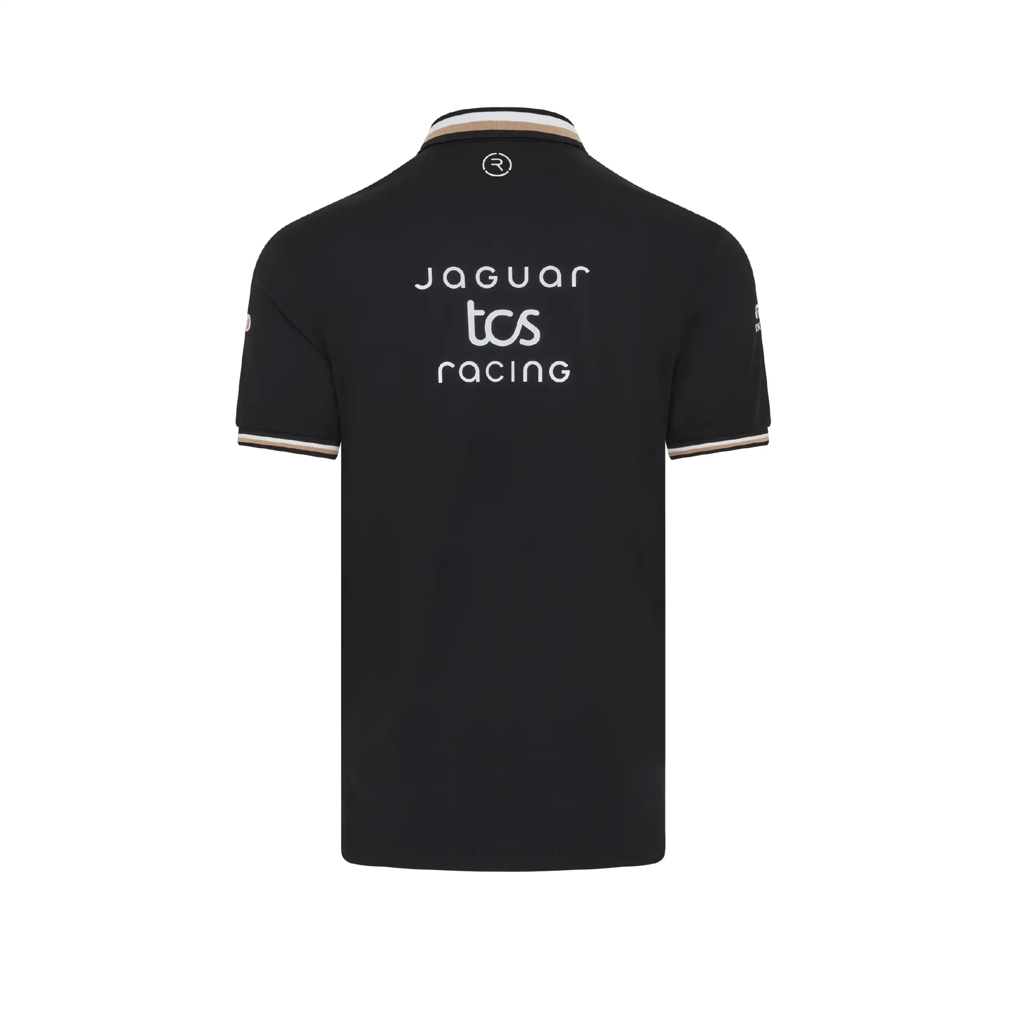 A performance-led polo featuring black fabric with white shoulder panels and a subtle gold trim. Made with our Reloop technology, using 100% recycled polyester for lightweight comfort. Ideal for warm race weekends and a polished option for representing Jaguar TCS Racing across the ABB FIA Formula E calendar on the golf course or in casual wear.