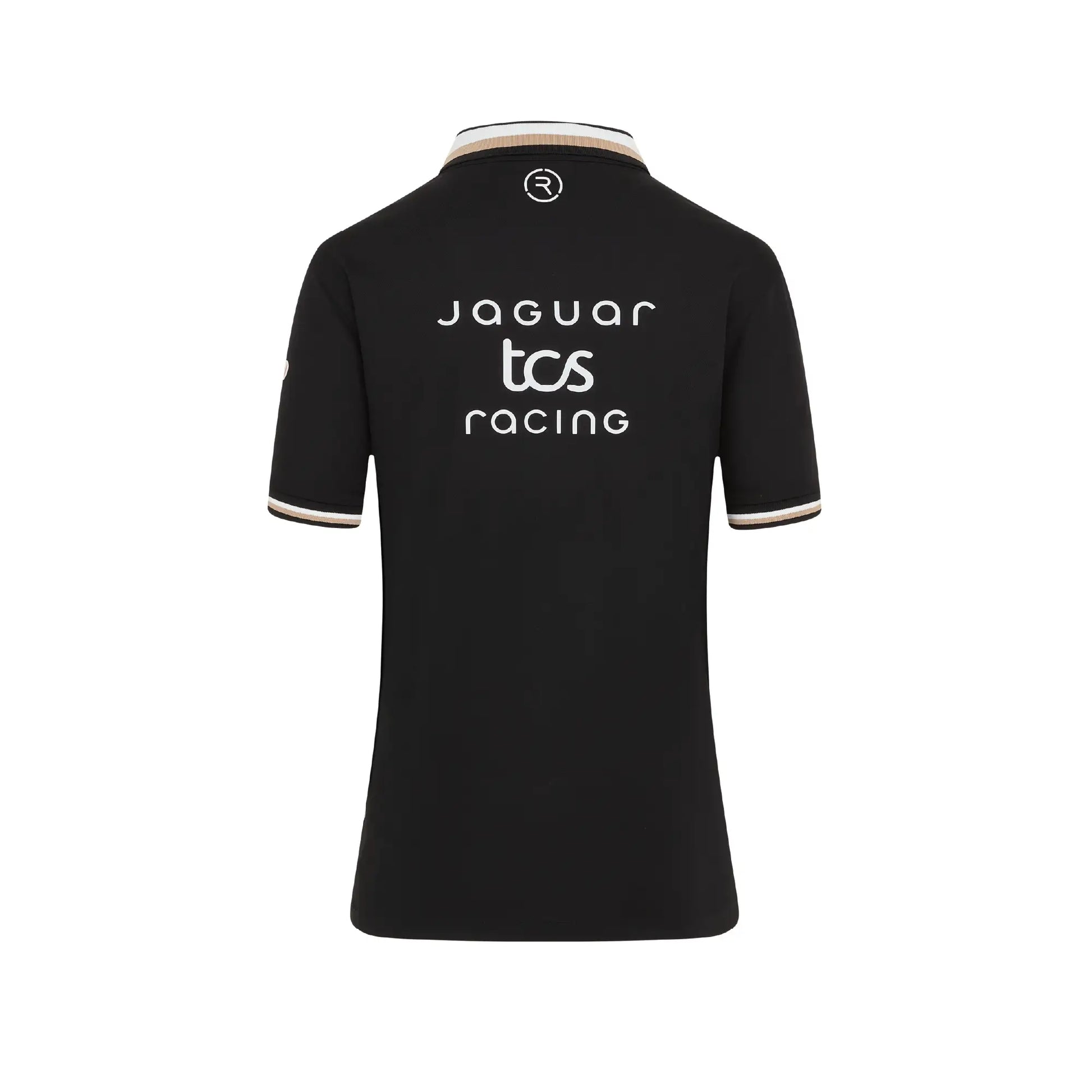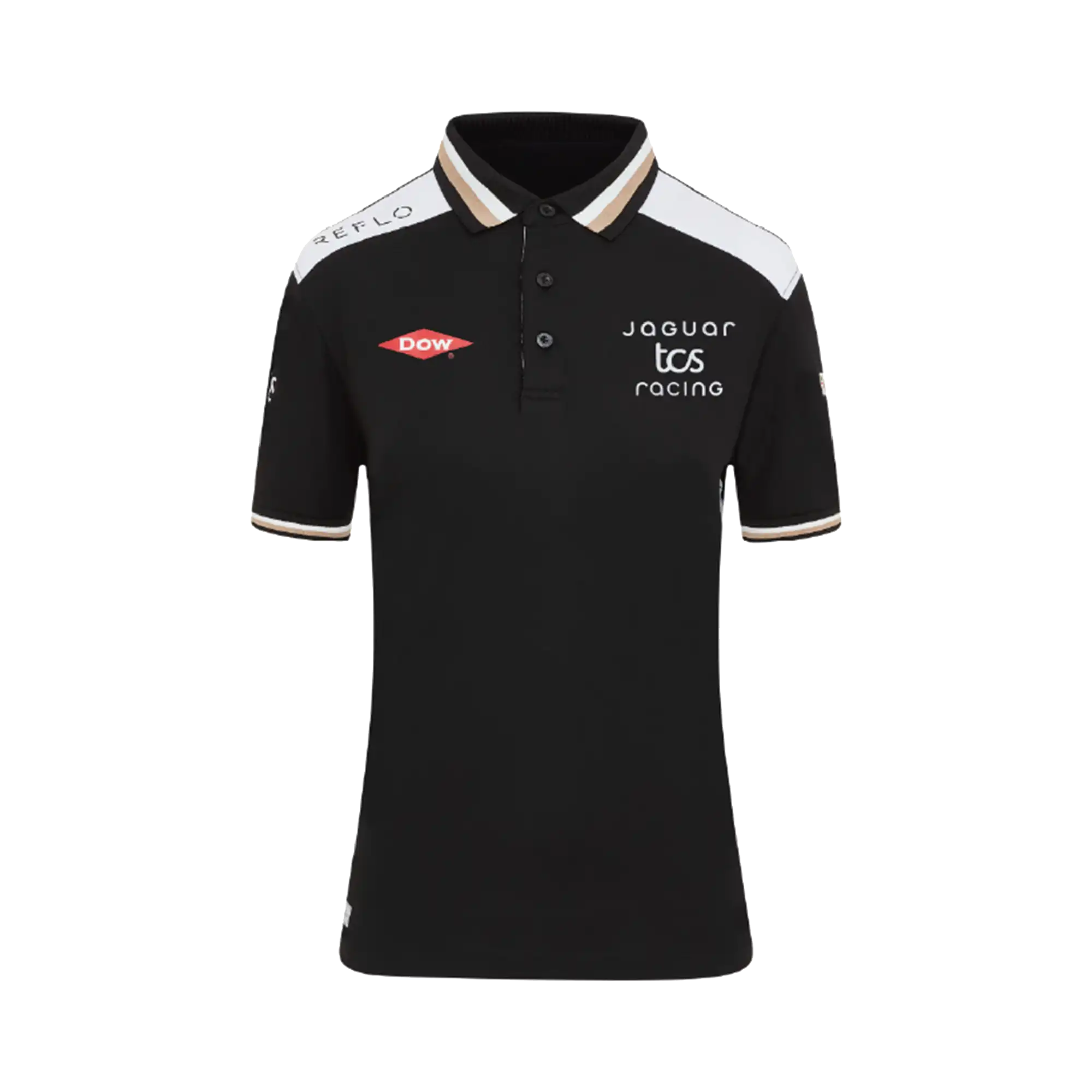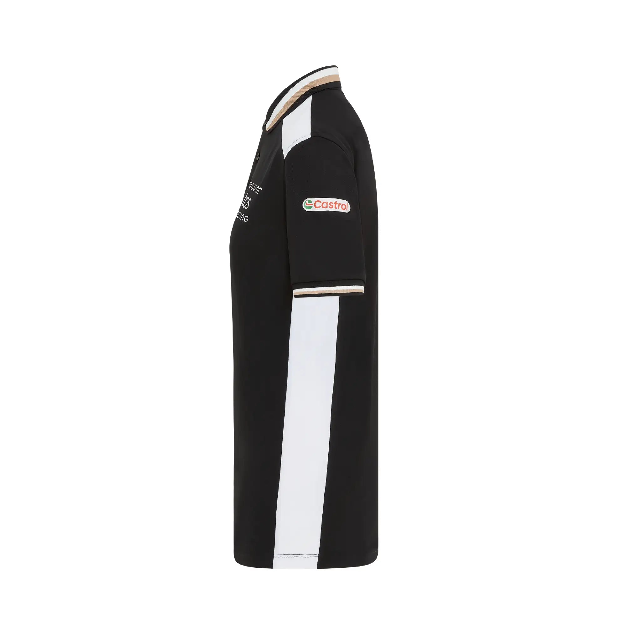 A performance-led polo featuring black fabric with white shoulder panels and a subtle gold trim. Made with our Reloop technology, using 100% recycled polyester for lightweight comfort. Ideal for warm race weekends and a polished option for representing Jaguar TCS Racing across the ABB FIA Formula E calendar on the golf course or in casual wear.