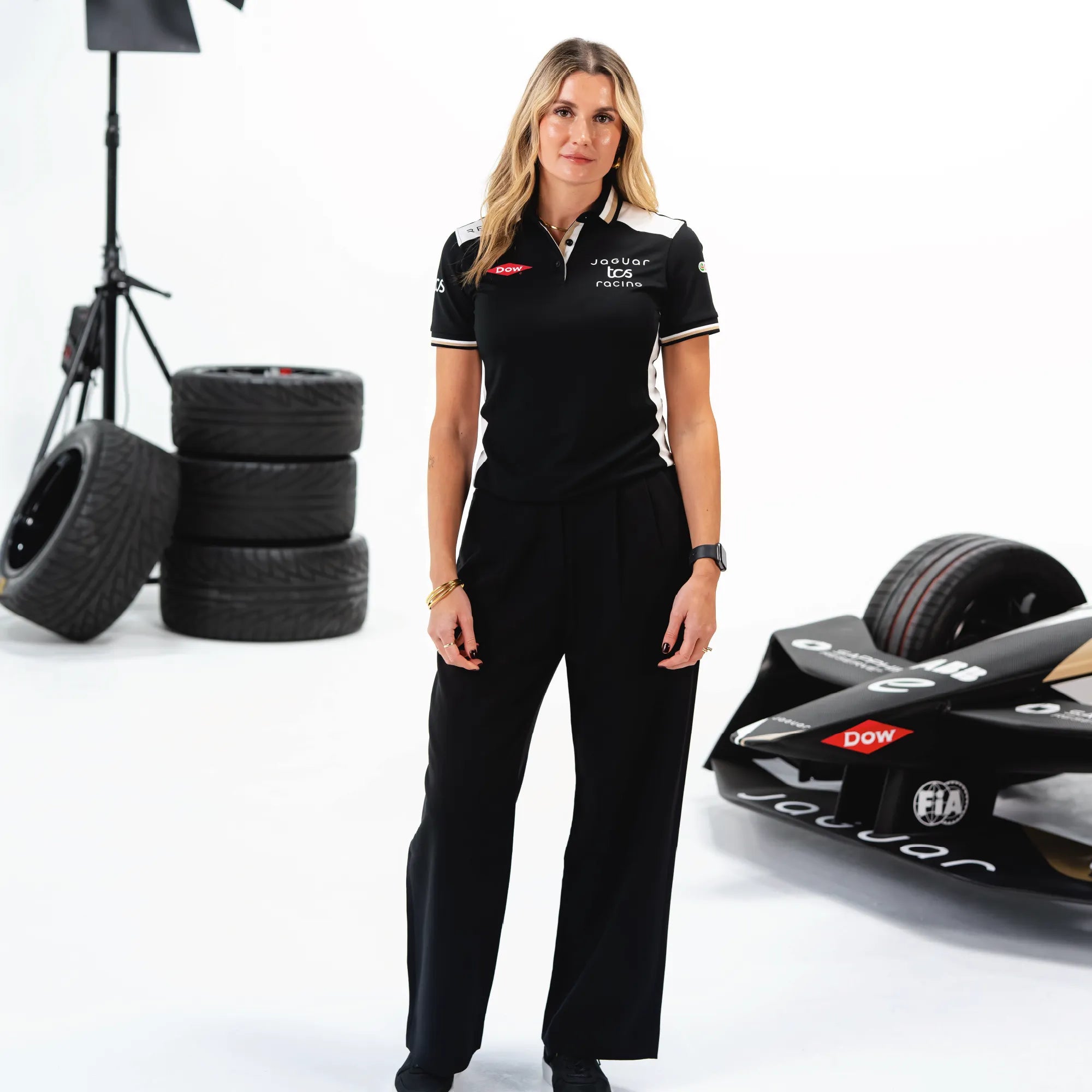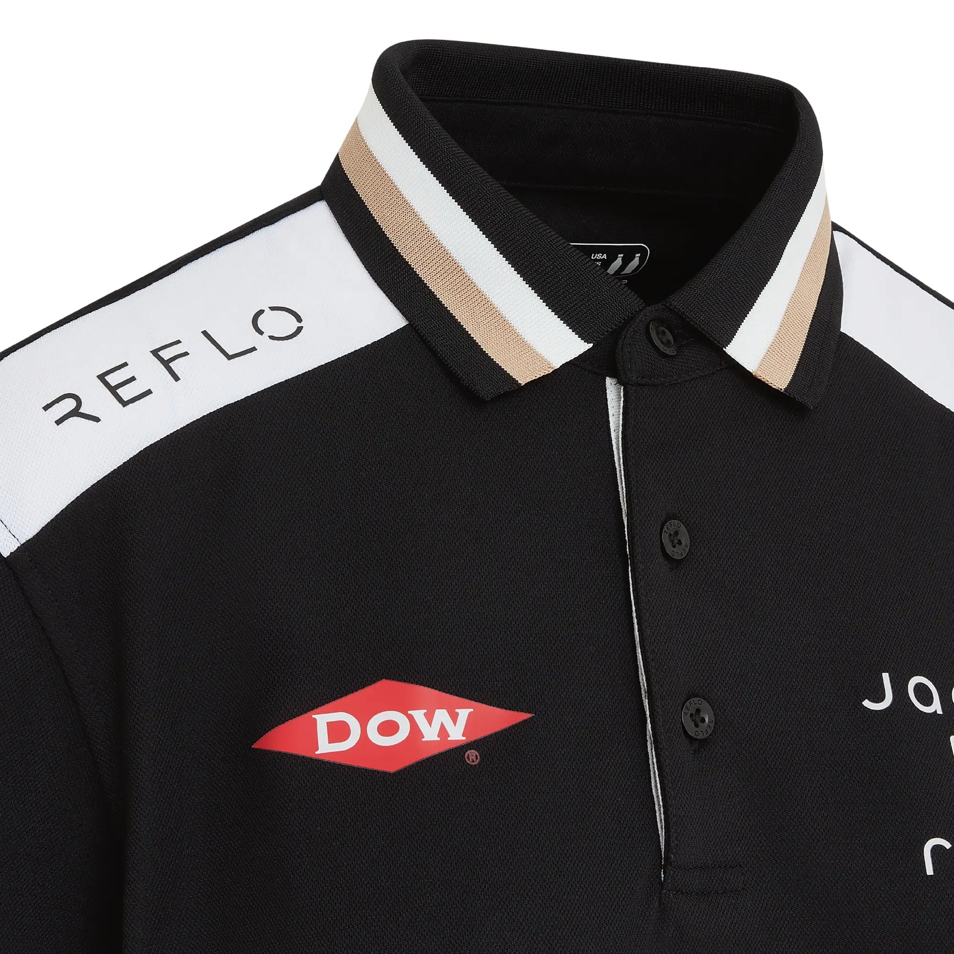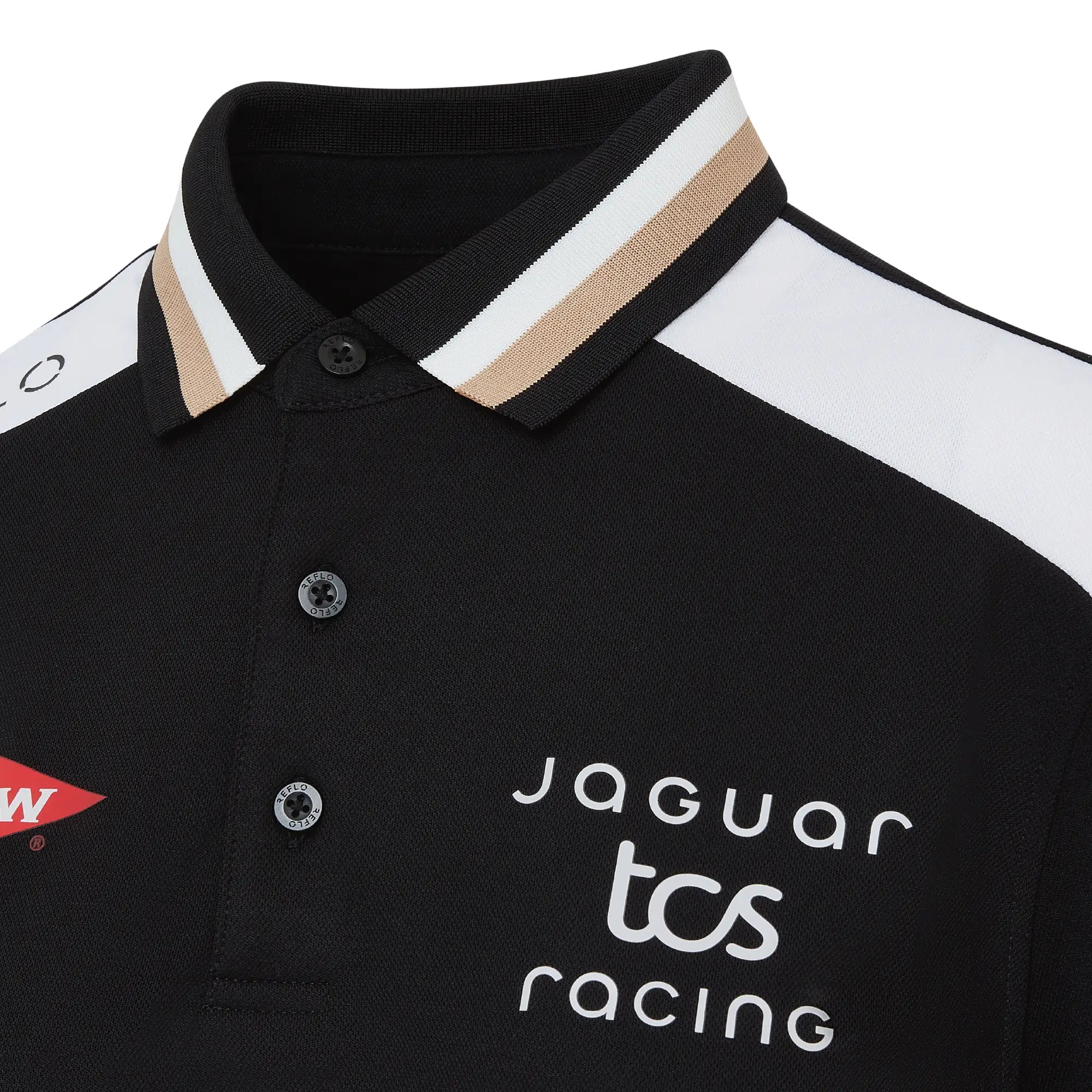 A performance-led polo featuring black fabric with white shoulder panels and a subtle gold trim. Made with our Reloop technology, using 100% recycled polyester for lightweight comfort. Ideal for warm race weekends and a polished option for representing Jaguar TCS Racing across the ABB FIA Formula E calendar on the golf course or in casual wear.