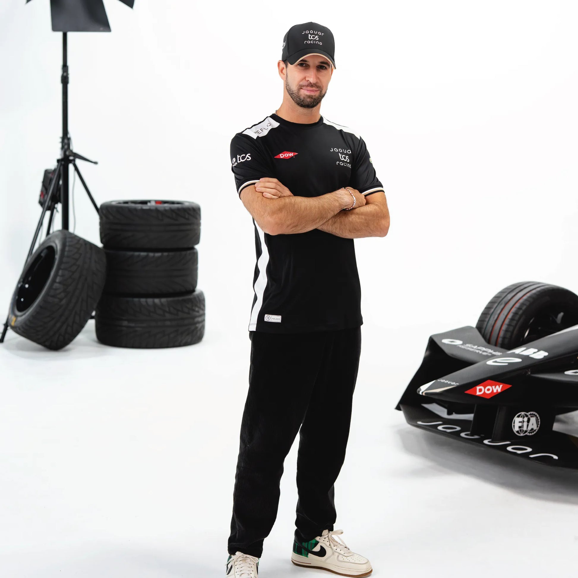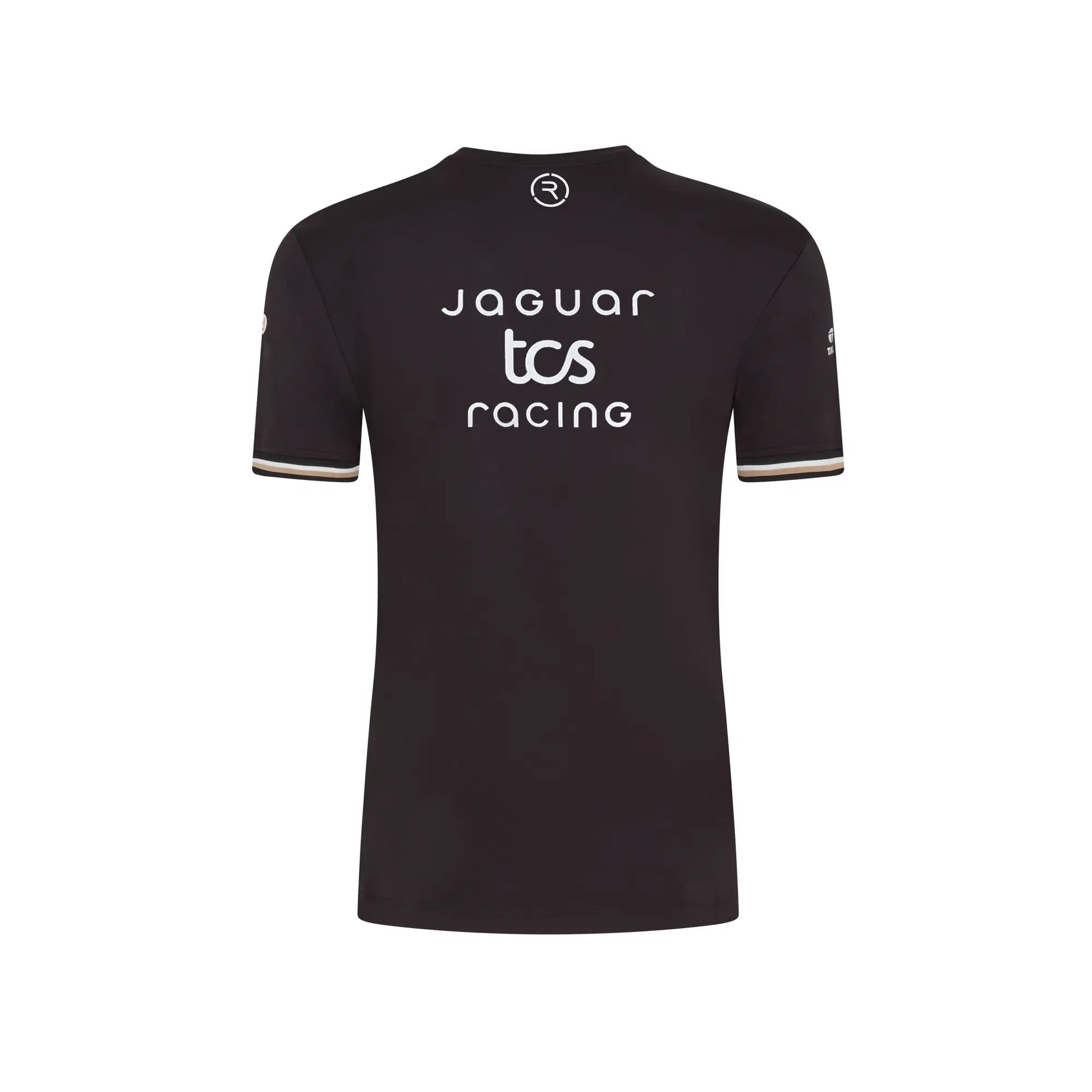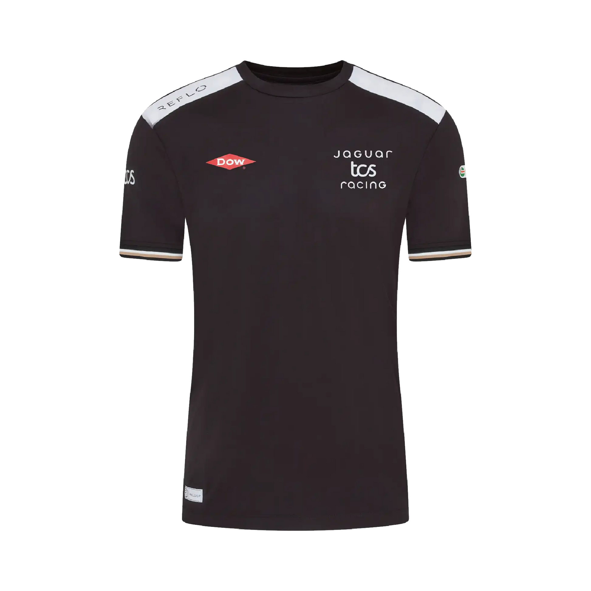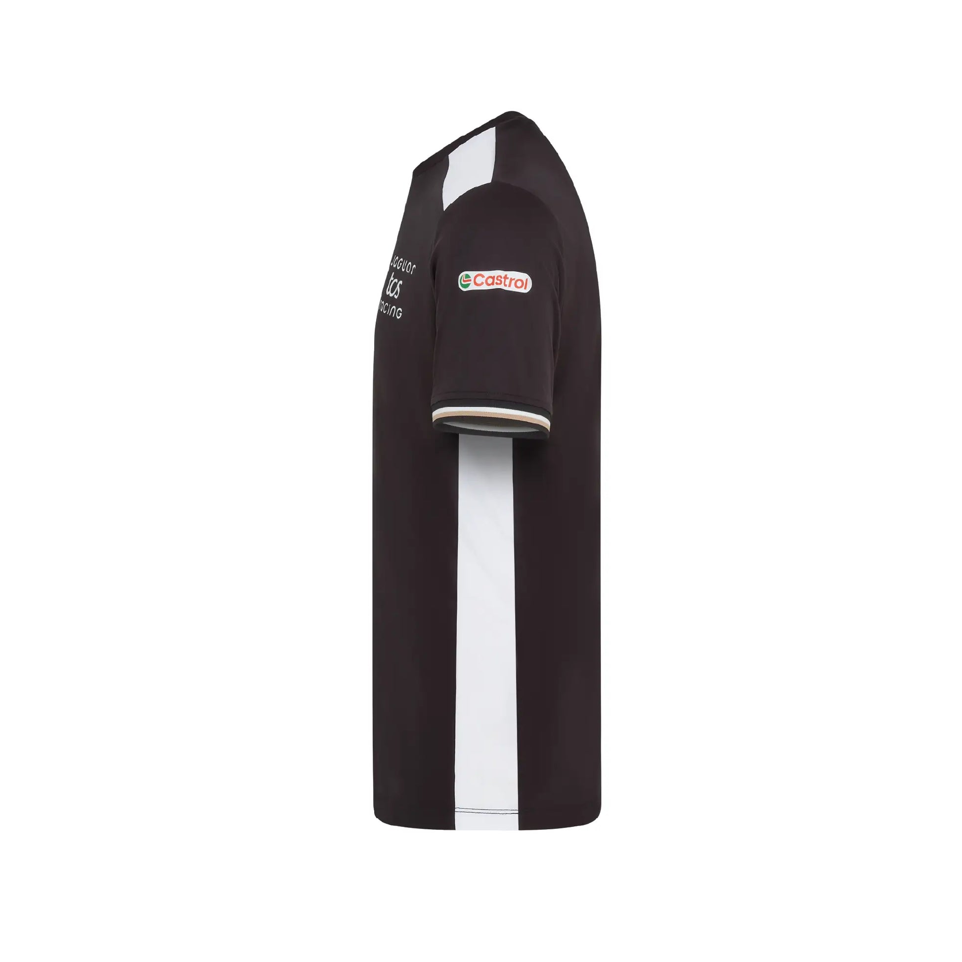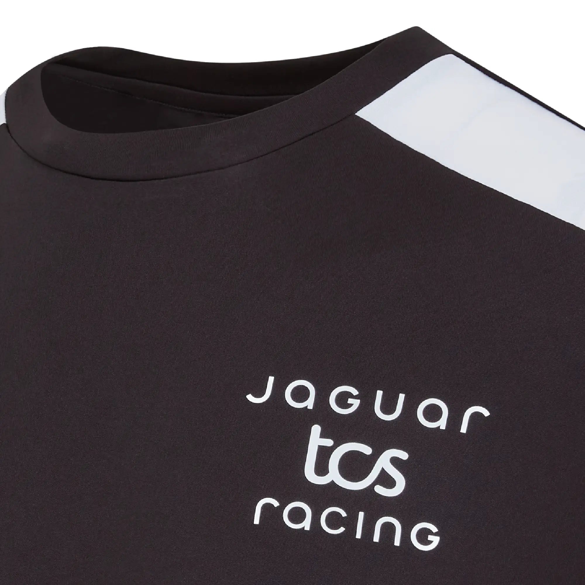 A lightweight performance tee made entirely from recycled polyester. The black design with white shoulder panels and gold trim delivers a clean, athletic look that represents Jaguar TCS Racing throughout the ABB FIA Formula E season. Comfortable, breathable and easy to wear for race days or everyday activity.